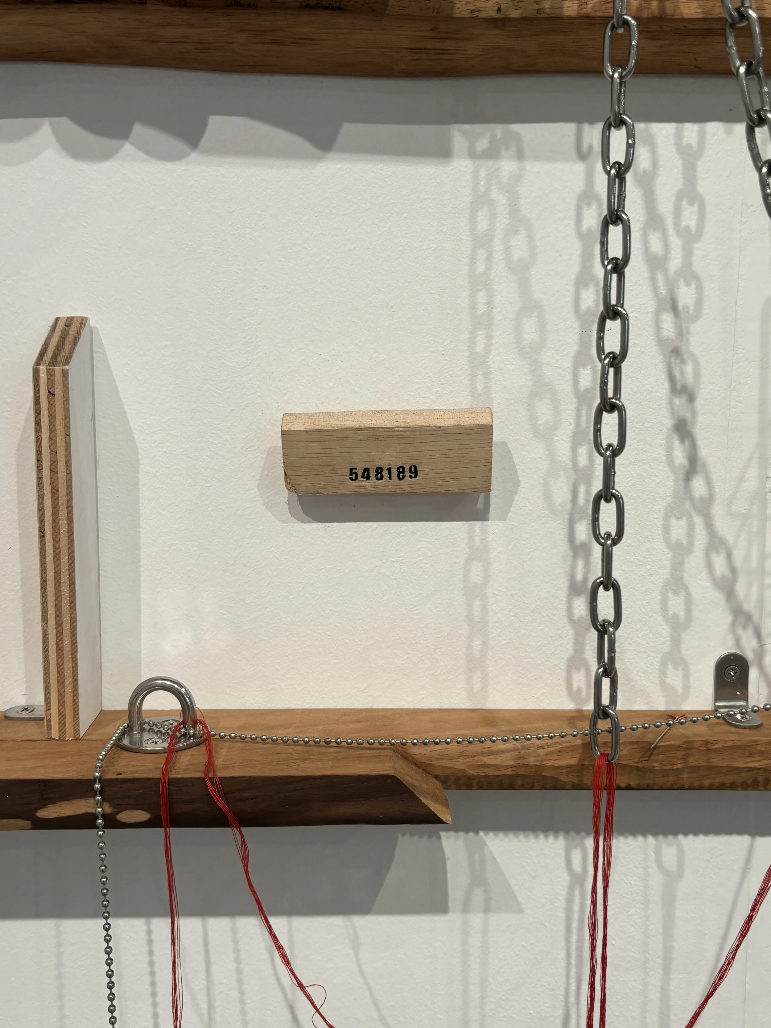 Teak, reclaimed wood, compressed wood, hinges, chains, metal beads, red threads, metal rod, alloy wave plate, old window frame, bamboo rod, metal door stopper.