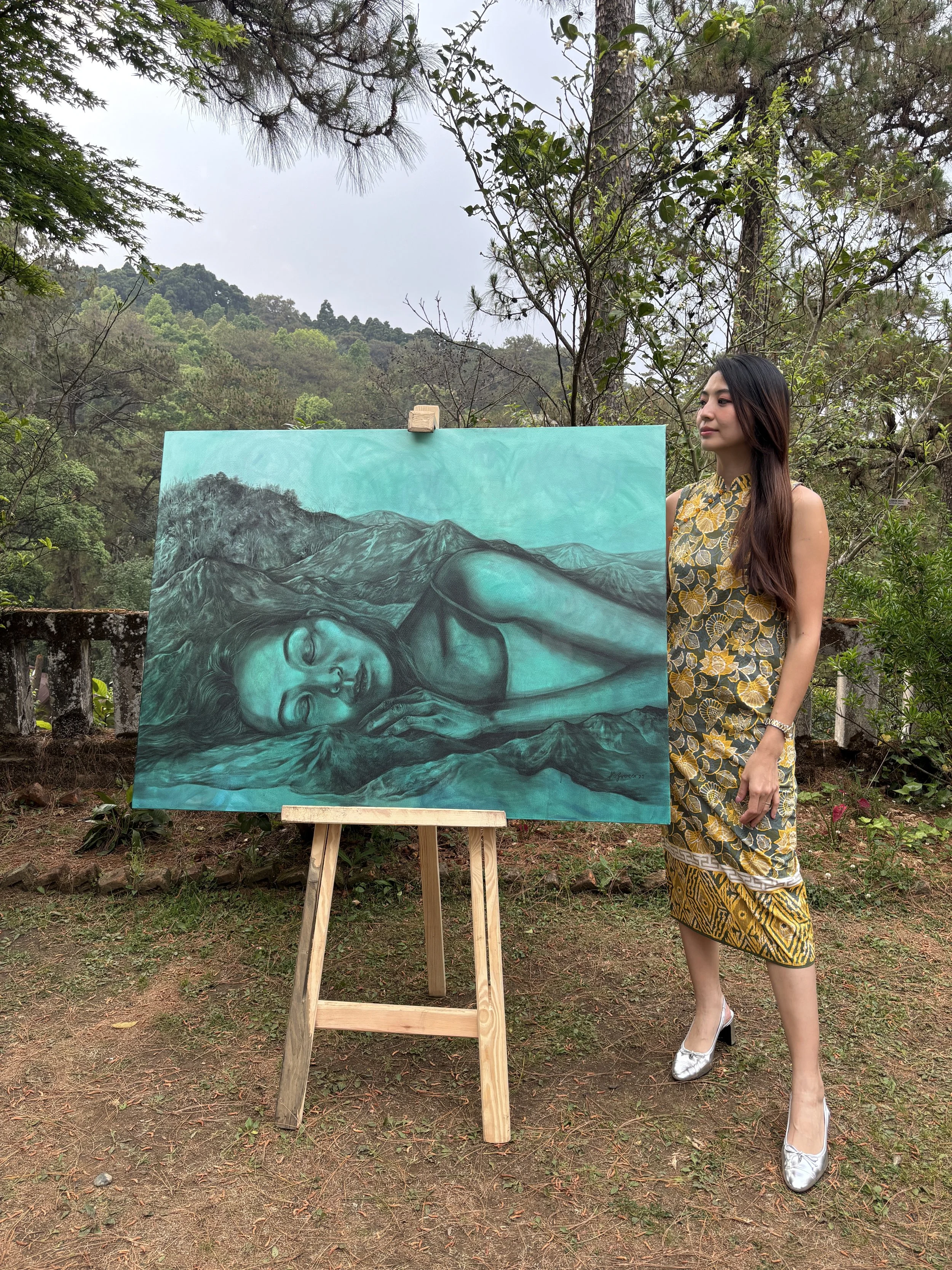 Laitlum is a woman is an autobiographical mixed-media painting on canvas, featuring the mountain ranges- Laitlum Grand Canyon of Shillong, Meghalaya. Captivated by the landscape and inspired by an excerpt of the Ramayana mythology, i borrowed the theoretical framework from OOF (Object-oriented feminism) the emphasis on the decolonizing of the object world, resisting Western logic that separates mind from matter, man from nature, subject from object. Sita is no longer simply a woman. She merges with the mountains, rivers, waterfalls, plants, and minerals — not metaphorically, but ontologically. Her body becomes landscape. Sita’s return to the earth is not a disappearance or defeat. It’s a reassertion of being-as-object, beyond the male gaze, beyond narrative resolution.