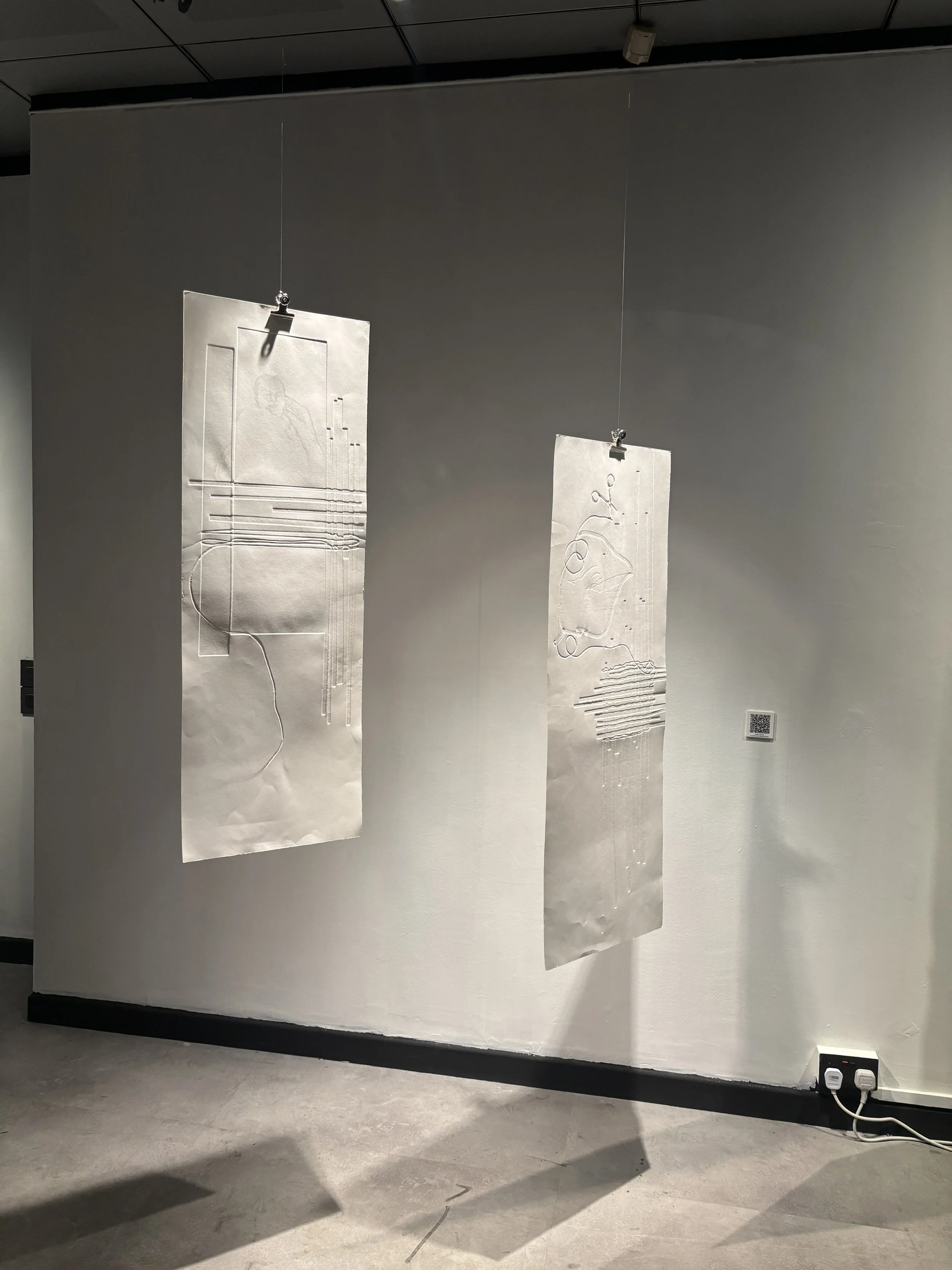 The selected works in this exhibition mark the early phase of this ongoing series. They originated from a period when I experienced speech impairment after my child turned one and a half—a rupture that produced a dissonance between cognition and expression, further complicating communication in domestic life. Informed by Maurice Merleau-Ponty’s philosophy of embodiment, these pieces seek to render visible the body's silent language—how it speaks through sensation, gesture, and absence. The use of subtle embossings and layered image transfers invites close inspection, mirroring the intricacies of lived experience that often remain unseen or unspoken.